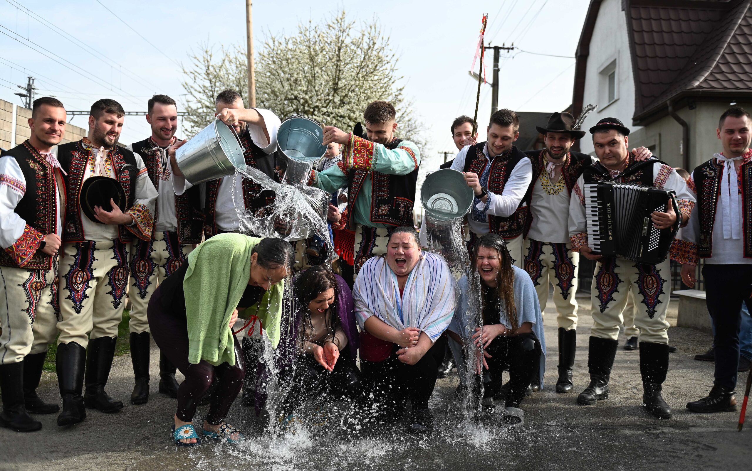 Chlapci v krojoch polievajú dievčatá počas tradičnej oblievačky a šibačky na Veľkonočný pondelok Foto: SITA/Tomáš Somr